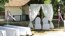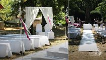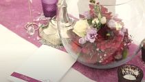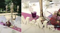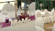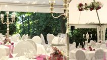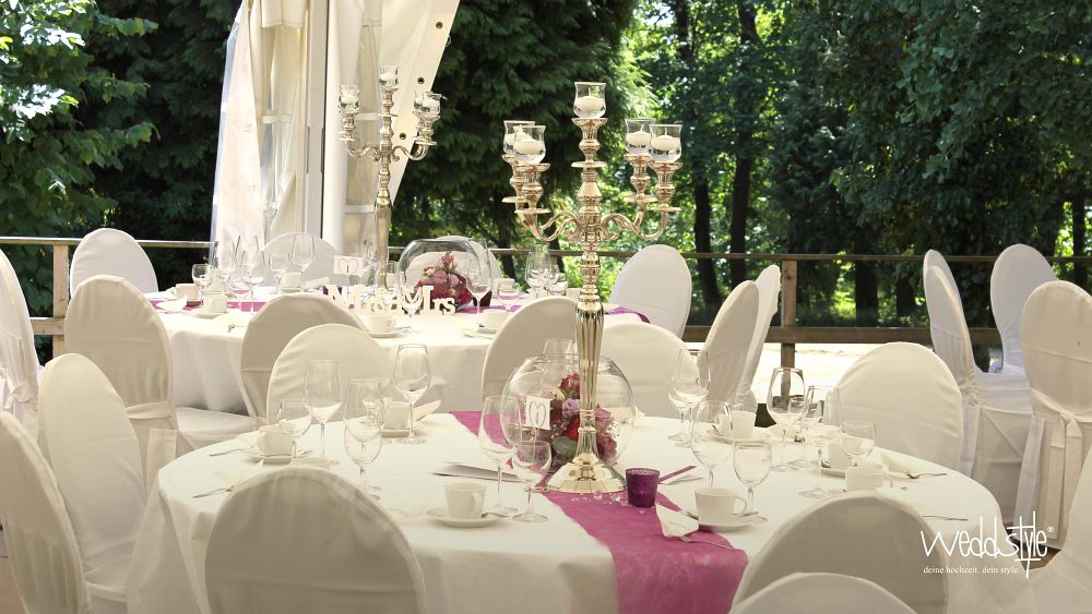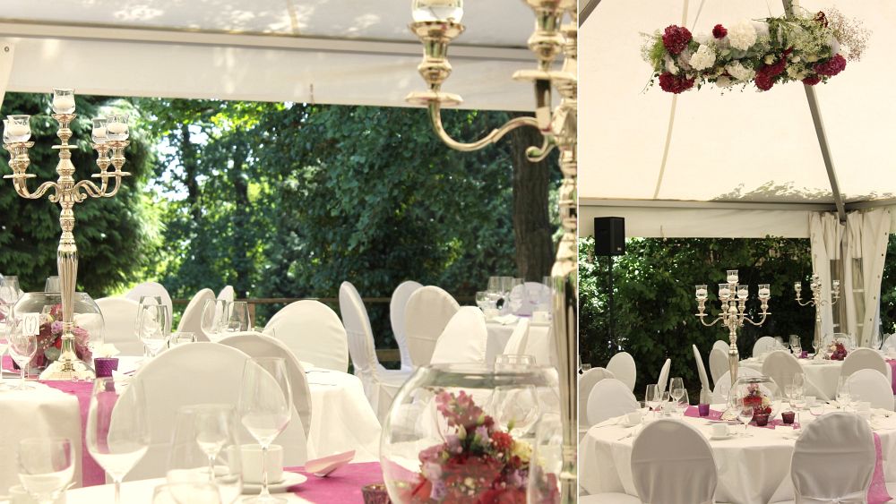 Das Parkhotel Schillerhain liegt inmitten eines wunderschönen Parks, so dass unser Brautpaar hier unter einem großen Hochzeitszelt Ihre Traumhochzeit feiern konnte. Inklusive Sektempfang, einer freien Trauung auf der Wiese und dem anschließenden Festessen im Park, haben wir das Brautpaar mit unserer Dekoration, Floristik und Beratung von Anfang an begleitet. Das Farbthema zeigt sich bei allen Dekorations-elementen, von den Einladungskarten bis hin zu den Tischläufer und Blumengestecken in den runden Glasvasen.