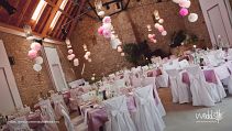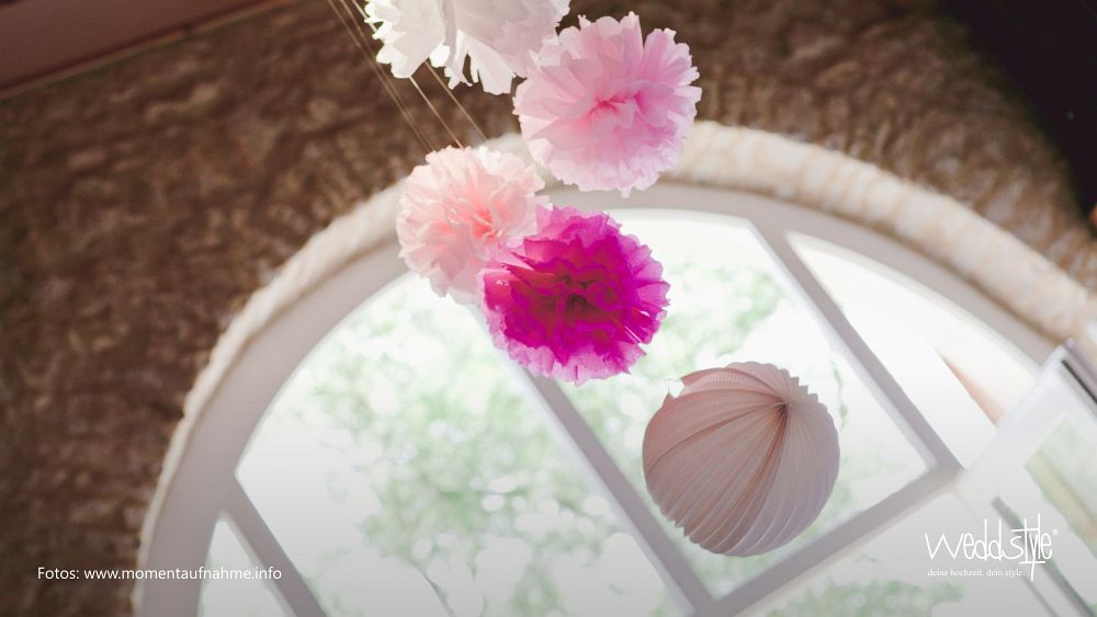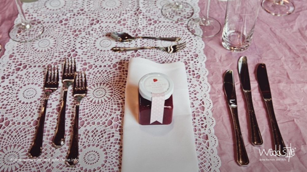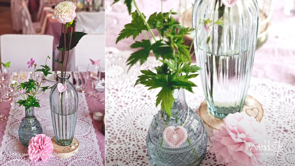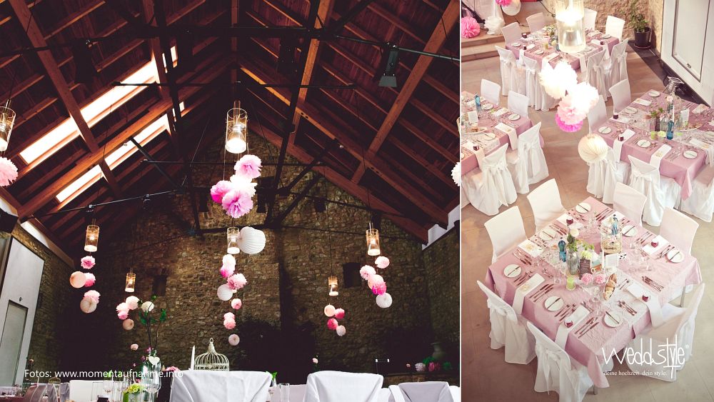In einzigartiger Atmosphäre konnten wir diese Hochzeitsdekoration in einer Scheune mit dem Farbthema Weiß-Rosa umsetzen. Als Tisch-decken nutzten wir rosafarbene Papiertischdecken mit Crash-Optik mit weißen Spitzen-Tischläufern. Eine tolle Kombination mit unseren Glasvasen und Vintage-Accessoires - danke an den Fotograf für diese tollen Impressionen unserer Hochzeitsdekoration.