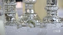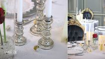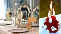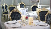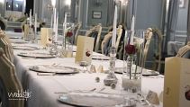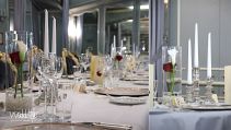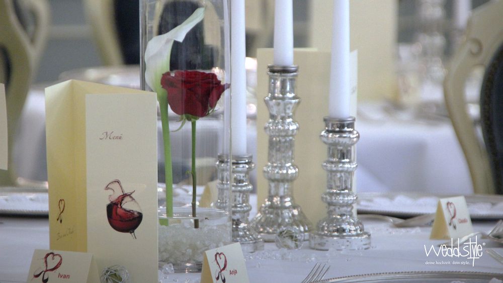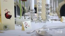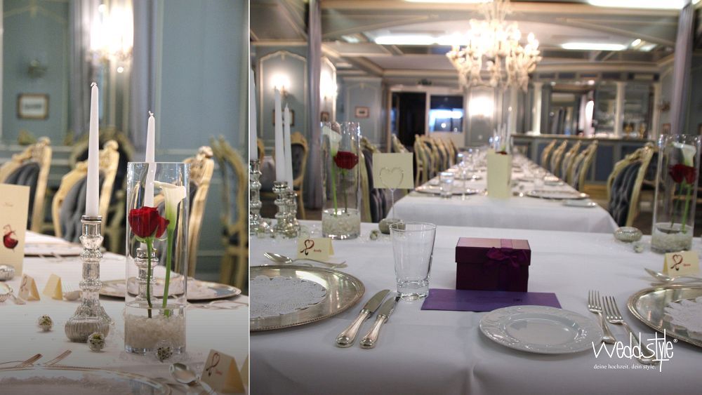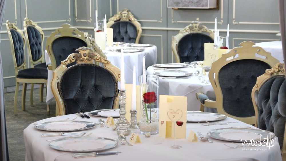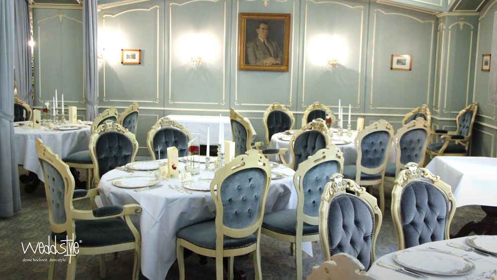 Der blaue Saal im Weingut Nack wirkt mit seinen hohen Polsterstühlen fast wie das Interieur eines alten Schlosses. Dadurch bedarf es auch nicht viel an Tischdekoration, sondern nur kleinen gezielten Akzenten wie Kerzenständer, Teelichter und Vasen um hier ein stimmiges Gesamtbild zu schaffen.