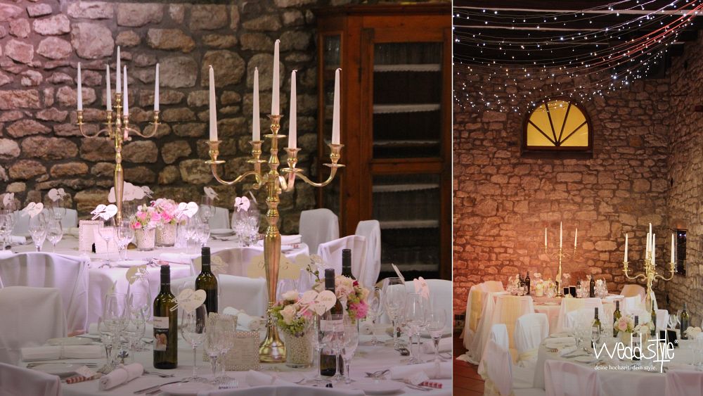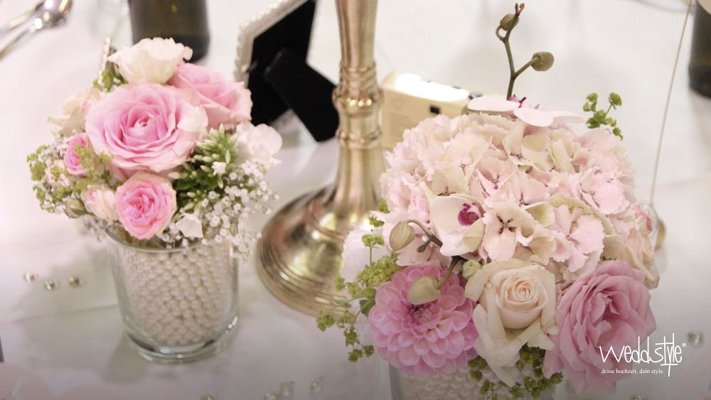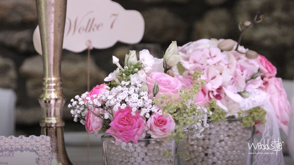 Der Junghof ist unbestritten eine unserer Lieblingslocations und so konnten wir hier schon einige ganz individuelle Hochzeiten eindekorieren. Für unser Brautpaar "Christina & Lucas" wählten wir zusammen ein traumhaft schönes Dekorationskonzept, mit goldenen Kerzenständern, Glasvasen und viele, viele Perlen, mit der wir der Tischdekoration einen ganz eigenen Charme geben konnten. Natürlich durfte auch nicht die Kirchendekoration und der Brautstrauß fehlen - wie man sieht ist die Braut überglücklich, und das ist es was für uns am meisten zählt.