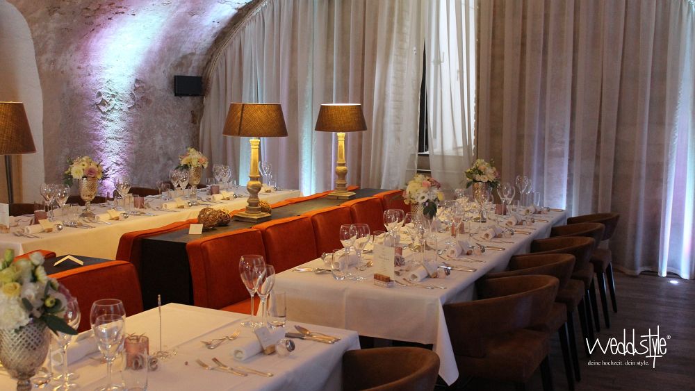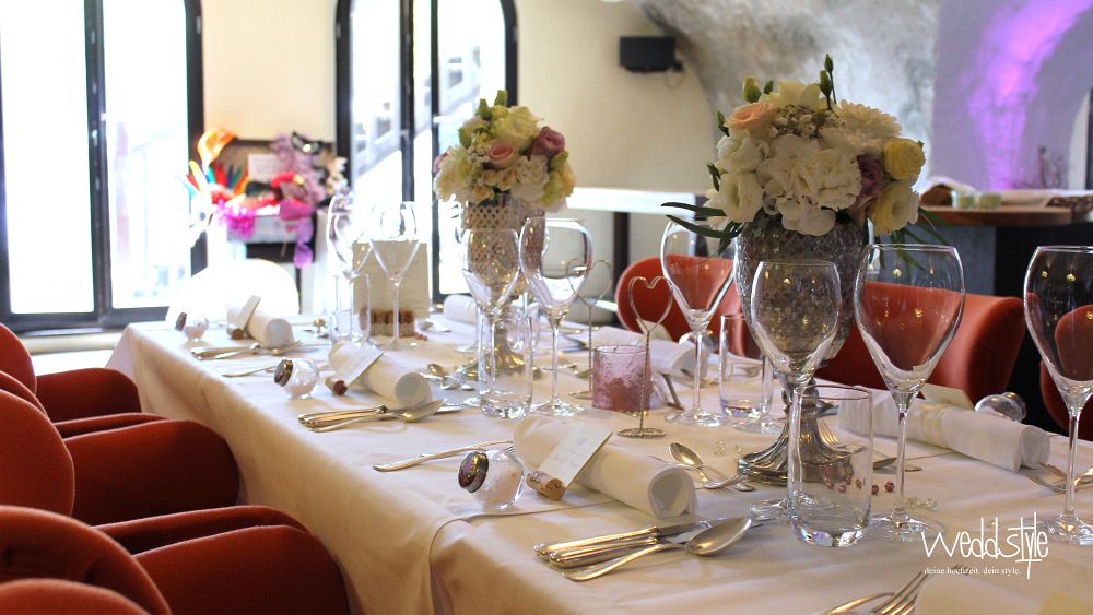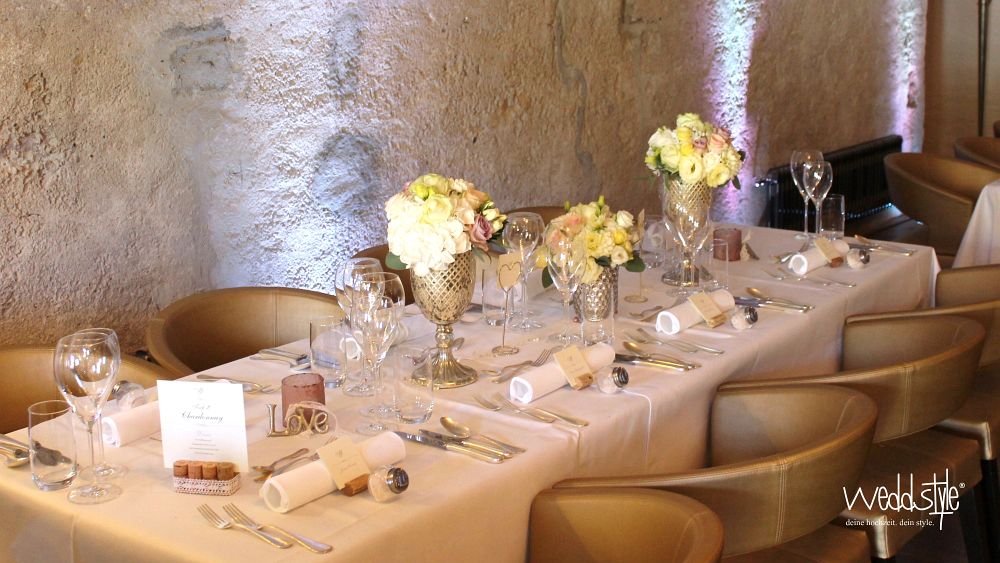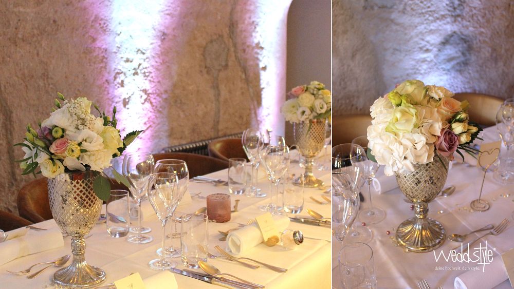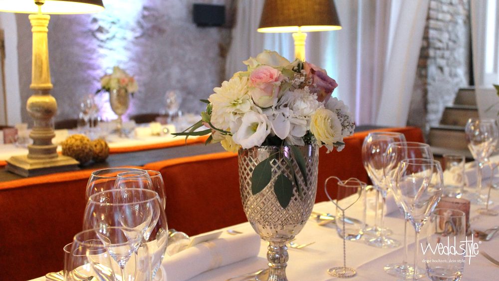 Schon mehrfach durften wir in dieser besonderen Location dekorieren, die sich neben den schönen Gewölberaum ganz besonders durch das ausgezeichnete essen bekannt. Hier wurden unsere silbernen Kelche mit Floristik in Szene gesetzt, die perfekt zu bestehenden Einrichtung gepasst haben.